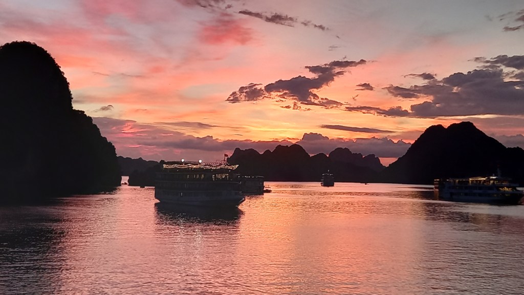 Now it’s all peaceful and the dragons are nowhere to be seen, since they are not needed anymore: no enemies and no dangers. The cruise we took had us picked up by bus early in the morning from steamy Hanoi and to the Hạ Long Bay, where we stepped on the boat we’d spend the next two days on. It was hardly a movielike cruise ship, yet it was charming: wooden hard floors, window and door frames, 4-star cabins with private bathrooms and air conditioning on the lower deck, and terrace and sun beds on the upper one. We had lavish lunch and dinner there, we sipped cool wine and cocktails, but what I loved most were the surreal colors of the skies and clouds at sunset, the fresh breeze and the pleasant chill of night. All of a sudden, the full green all around had turned dark pink and reddish yellow – and these words don’t even do it justice.