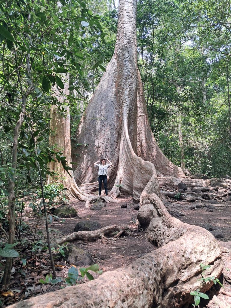 Am explorat și rezervația propriu-zisă: traversând râul Đồng Nai cu bacul, am pătruns în adâncul pădurii, deși am intuit corect că să merg mai mult de un kilometru pe jos nu ar fi fost tocmai realist. Totuși, am ajuns la faimosul copac Tung, cunoscut drept Copacul Tung al Unchiului Đồng, denumit așa în cinstea fostului premier vietnamez Phạm Văn Đồng. Vechi de peste 400 de ani, cu o înălțime de peste 30 de metri și un trunchi atât de vast încât ar putea adăposti aproape 20 de oameni, copacul Tung impresionează nu doar prin măreția sa, ci și prin rețeaua de rădăcini arcuite, întinse asemenea unor coloane în miniatură.